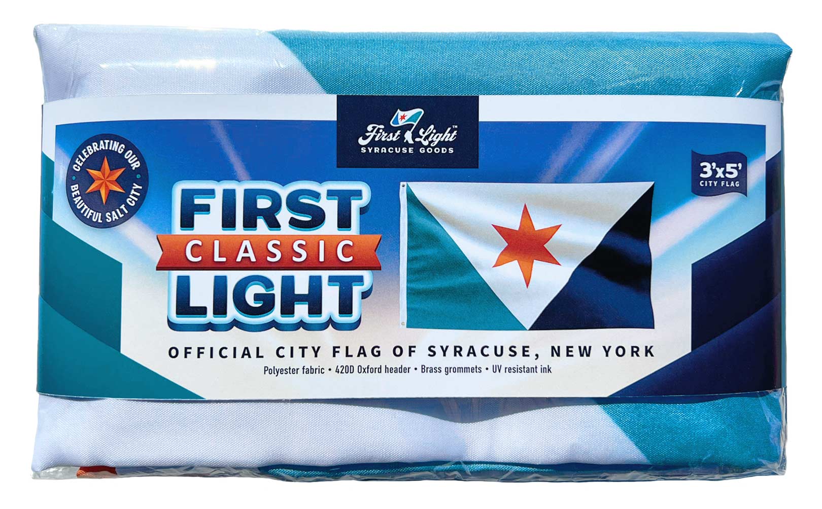 The Classic. The Original. The Standard. Adopted as the official Syracuse city flag on Flag Day 2023, the First Light flag represents our land, our people, our hopes, and our dreams.